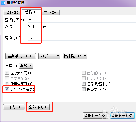 仍然快捷键Ctrl+F,在替代选项中,将“我”全数替代为“*”,注重这时不要勾上“利用通配符”。