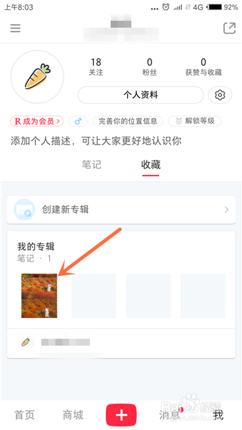 在保藏的选项下方显示的是我们的专辑,想要找到保藏的笔记需要知道保藏的对应专辑,点击打开该专辑。