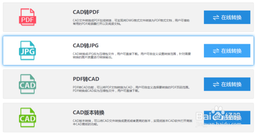 这里我们可以选择在线转换的方式,便利有适用。百度搜刮CAD在线转换器,进入在线转换界面,选择CAD版本转换。