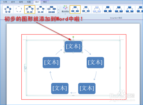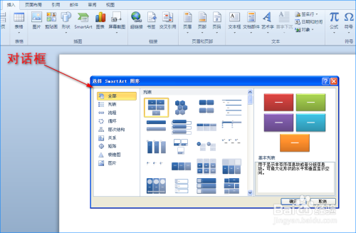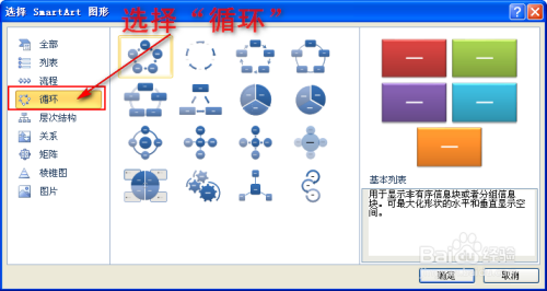 选择”轮回“后,在对话框右侧会呈现多种轮回图形,然后我们按照本身的需求选择合适的图片,再点击”确认“按钮,如许初步的图形就添加到Word文档中啦。如图所示: