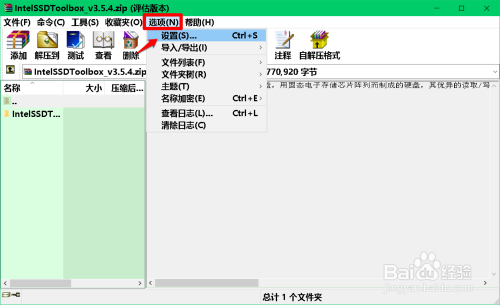 点击WinRAR压缩文件,在打开的压缩文件窗口中,点击【选项】-【设置】;