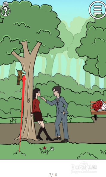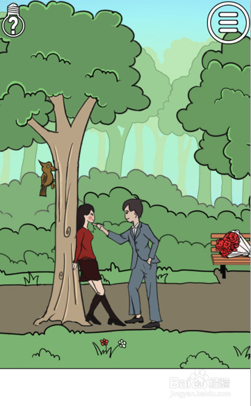 选择第17关卡,进入游戏,我们可以发现女本家儿角背靠着树,等候着男本家儿角的惊喜,四周有一簇玫瑰花,而树上刚好有一个啄木鸟。