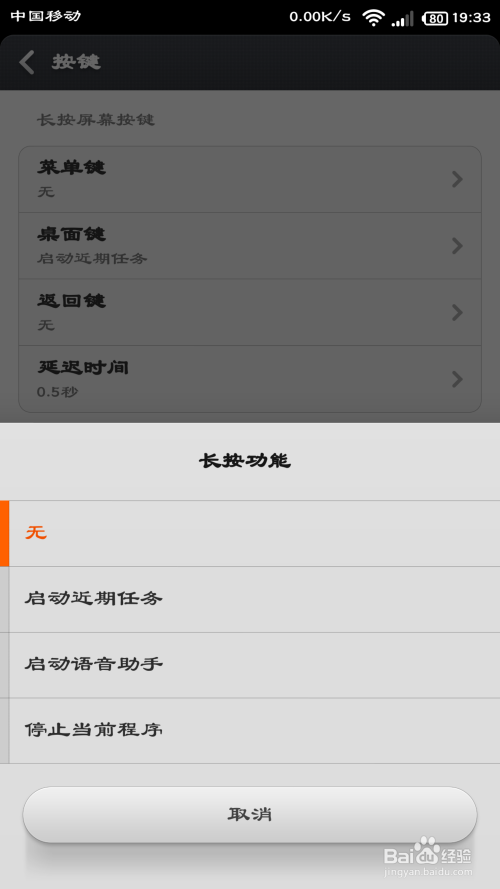 接下来,进入菜单键的按键设置,然后选择“无”,封闭长按菜单键的功能。