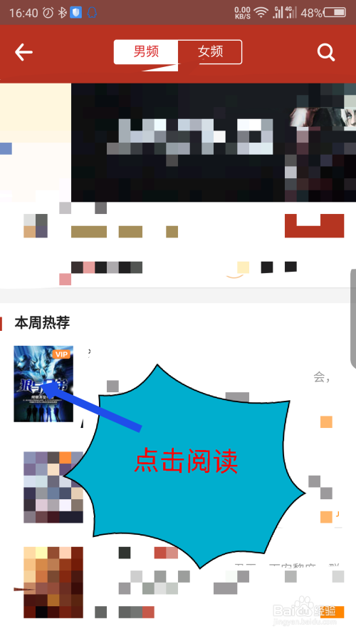打开VIP专区后,能看到上面分为男频和女频两个选项,选择一个喜好的小说点击阅读。如图所示