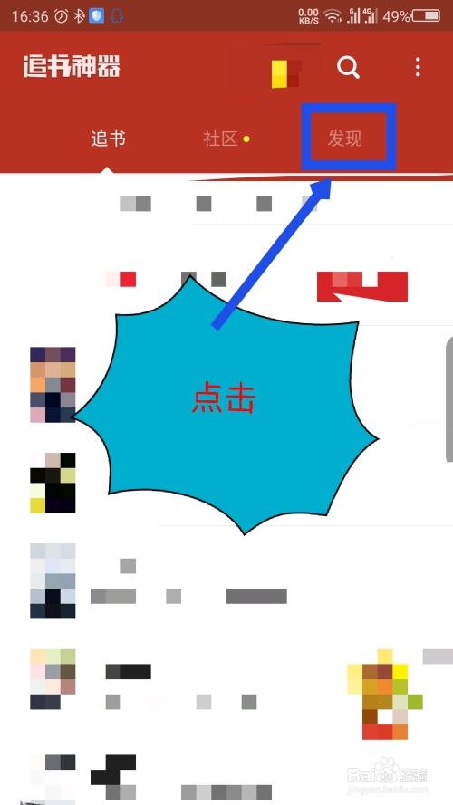 打开追书神器,在软件的上面的导航栏菜单中,点击最右边的发现菜单。如图所示