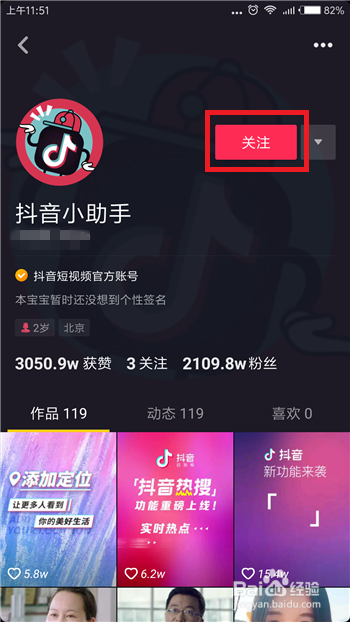 点击后会打开抖音小助手的小我本家儿页,在里面点击【存眷】选项就可以存眷到抖音小助手了。
