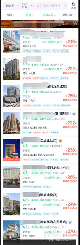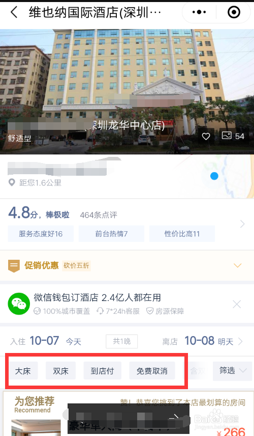 选择距离近的,还有评分高一点的比力好。价钱选本身可接管规模内的。点开一个,看看具体的环境,好比,是年夜床仍是双床,是到店付条目仍是在线付条目的。是否能免费打消,必然要选能免费打消的,因为假如误车了或者没找到处所,预定酒店的时候事后,就会扣钱。最好是选择到店付。