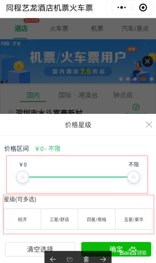 选择入住时候,设置地址和选择星级,然后点击查询,也可以选择指定的酒店搜刮,好比如家,7天连锁等。
