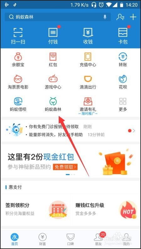 首先打开手机上的付出宝软件,然后再首页中找到蚂蚁丛林,点击进入蚂蚁丛林