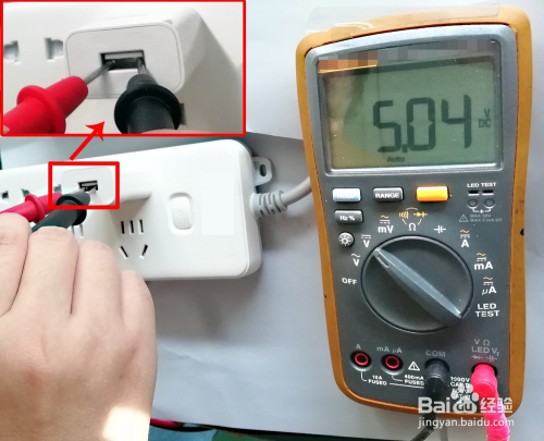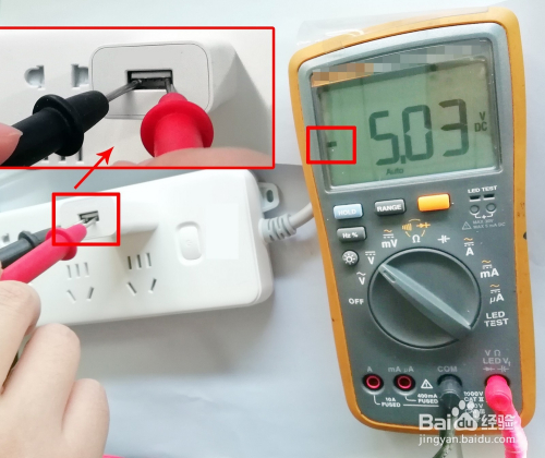 注重,不要让两个表笔接触到充电器内壁的金属,以免万用表短路测不出电压值。