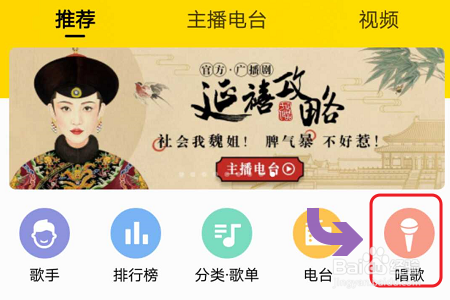 在酷我本家儿界面的右上角有一项“唱歌”,点击之后在切换到的唱歌界面即可起头“点歌”了,如图二...