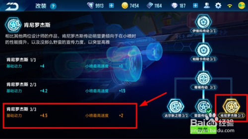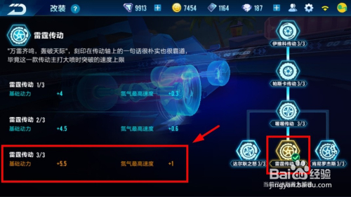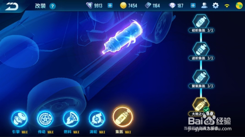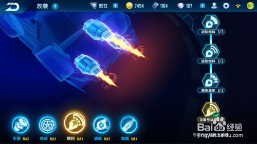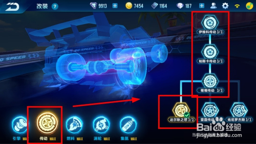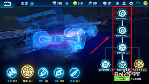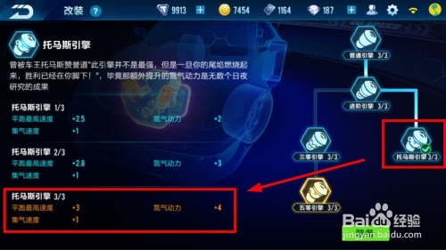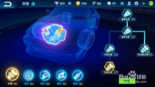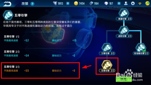 和竞速改装一样,将“燃料/涡轮/集氮”改满,引擎选择“五菱引擎”分支(对照竞速数据)