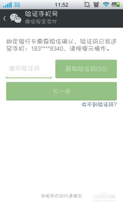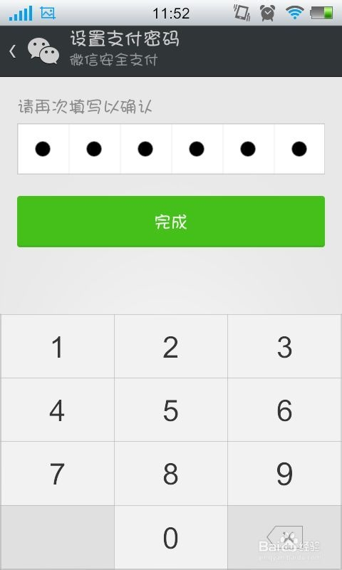 手机短信验证码验证完毕之后就需要我们设置付出密码了,付出密码的设定最好不要与银行卡取条目密码不异,输入完毕之后,我们的微信付出功能便当作功开启喽。