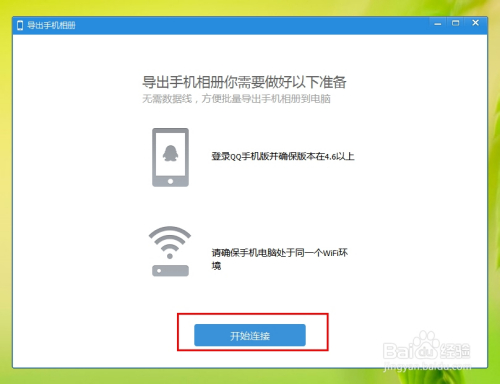 然后我们选择了该选择项之后,就可以进行下一步的操作啦,接下来打开的就是QQ手机相册导出的功能界面。点击“起头毗连”。