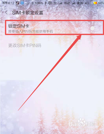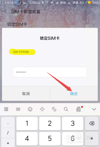 然后在打开的页面中可以看到它是处于封闭状况的,点击它开启,然后在弹出的页面中输入本来的SIM的PIN码,一般是四个0或者是1234(切记,只要3次机遇,不要输入错误了),完当作之后,点击 确定,然后就开启SIM的PIN密码了。