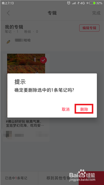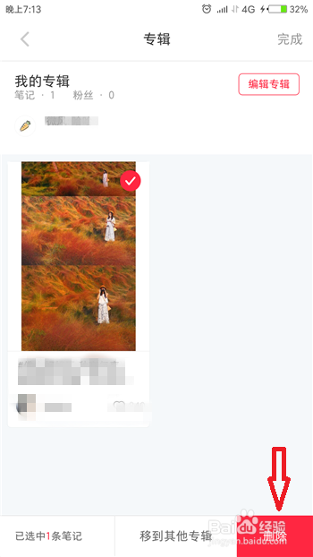 点击办理之后就可以鄙人方选择专辑中想要删除的笔记了,选择好后点击右下角的【删除】。