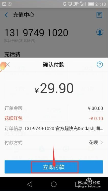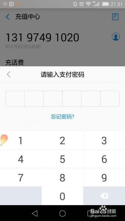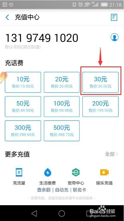 进入充值中间后,输入本身的德律风号码,若是以前用付出宝充值过话费,就会主动将此号码存为默认号码,选择充值的金额;