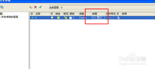 打开“图层特征办理器”之后,我们点击此中的一个默认图层,即系统默认的0图层中,我们可以看到“线宽”的设置。
