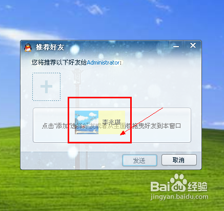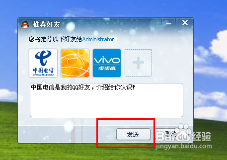 接下来,我们将选项框里面已经添加的老友添加完毕之后,点击“发送”,然后对方就能收到我们给他保举的QQ老友了。
