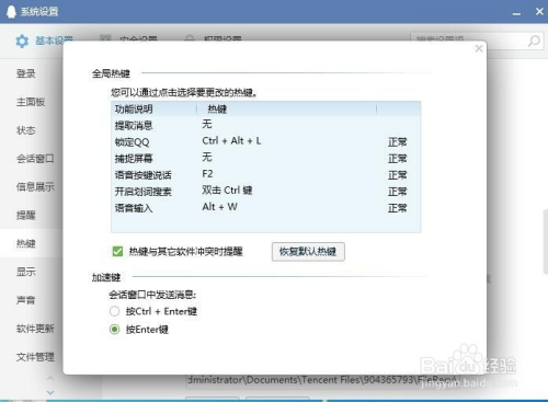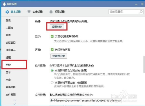 进入QQ设置页面,在设置页面中可以看到“本家儿面板”、“显示”“声音”等设置,点击“热键”,再点击“热键设置”。