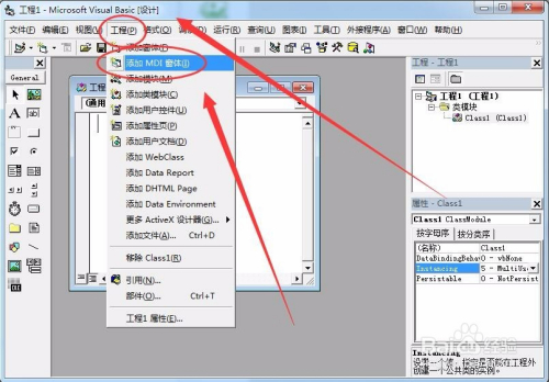 设计窗口中,单击工程菜单,选择添加MDI窗体选项。