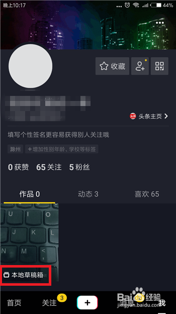 点击后会打开抖音的小我中间,在【作品】的下方可以看到有视频会标识表记标帜为【草稿箱】,这里就是抖音的草稿箱,点击打开。