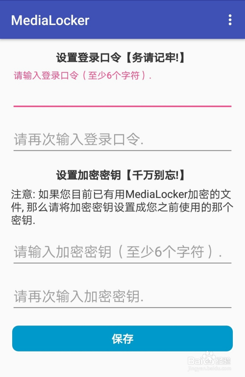 安装后初次运行,首先看到平安设置页面。用户必需在这里设置登录口令和文件加密密钥。登录口令用来登录MediaLocker,加密密钥用于加密文件。此二者都必需记牢,若是健忘了加密文件就找不回来了。