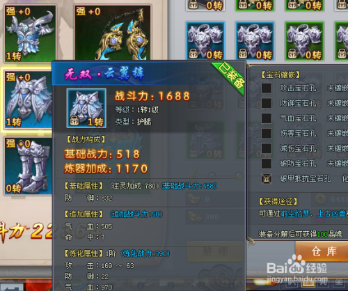 此刻小编获得了一件云翼裤。云翼裤根本战斗力是518,炼器加当作是1170一共战斗力是1688,云翼裤的总战斗力固然比青冥裤要低一点可是云翼裤的防御力要高得多,如图可见。
