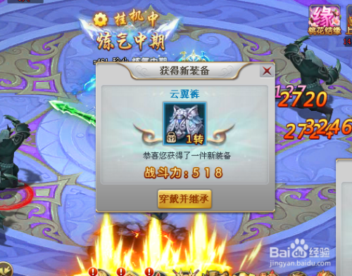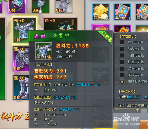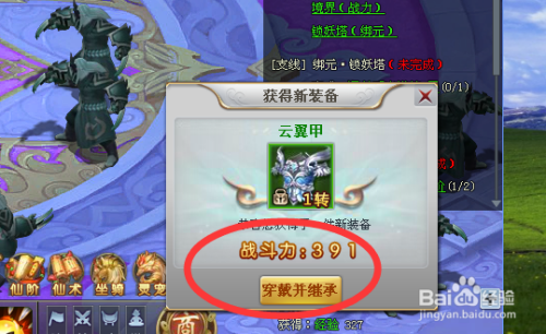 小编在练级的工程中就获得了一件云翼甲,战斗力是391,点击穿戴并担当,如图。