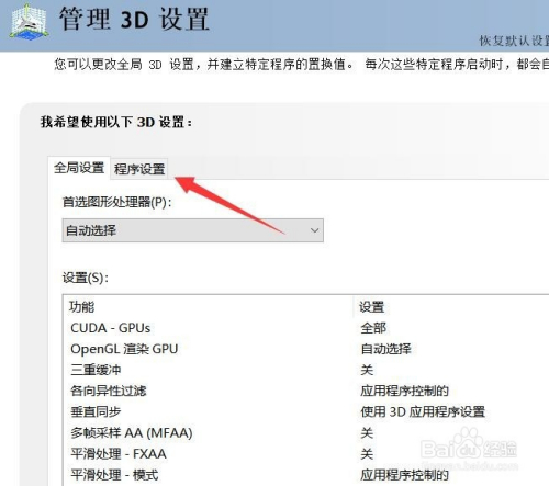 办理3d设置里面选了第二个法式设置,挨着全局设置的旁边。
