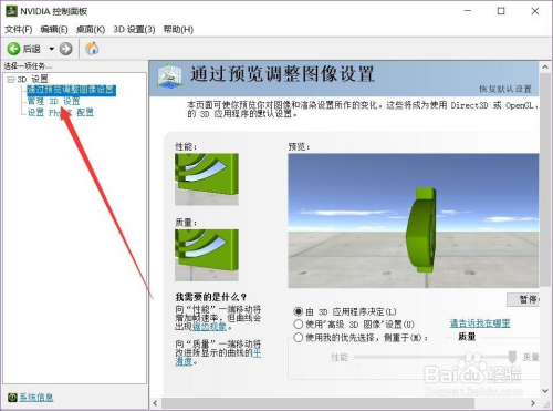 在NIVDA的节制面板里面选择办理3d设置,就是红色箭头处第二排这个。