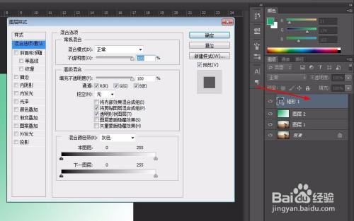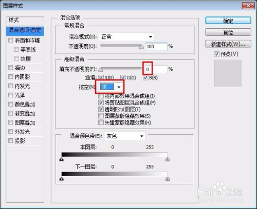 第七步:“高级夹杂”中不透明度设置为0,“挖空”设置为浅,添加描边,颜色设置为白色,大小按照本身的需要调节,添加投影,设置完当作后单击“确定”按钮。