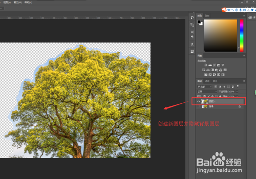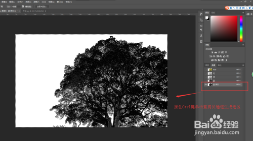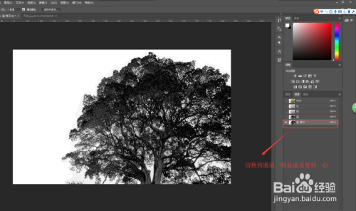 然后按住键盘上的Ctrl辅助键,鼠标单击蓝色拷贝通道,生当作一个拔取,在选择RGB复合通道,并切换回图层面板,选择图层1,执行Ctrl+shift+I反选选区,然后单击图层面板下方的添加蒙版,如许我们就看到年夜树被完整的选了出来。