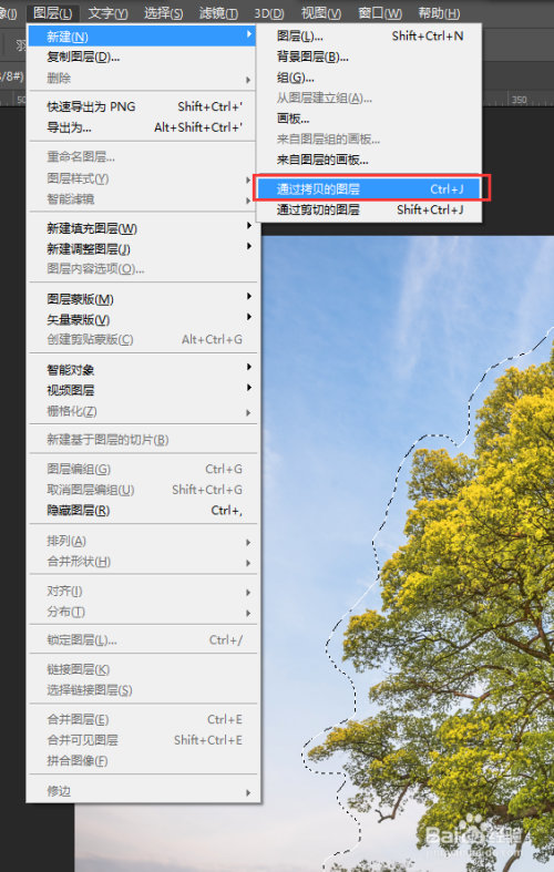 选择PS左侧东西栏中的套索东西,然后用套索东西将年夜树的轮廓圈选出来发生一个拔取,如许做是为了对后面的操作削减不需要的干扰。