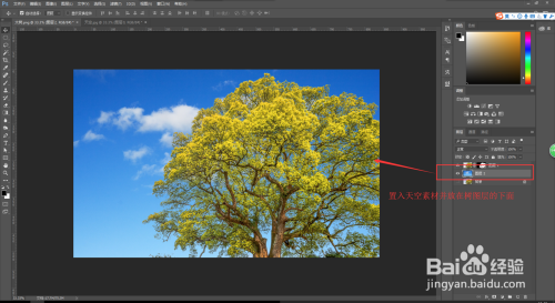 拖入我们的天空素材,并将天空素材放在图层1的下方,调整晴天空素材的大小与位置。如许我们就经由过程PS通道抠图并为素材改换了天空布景。
