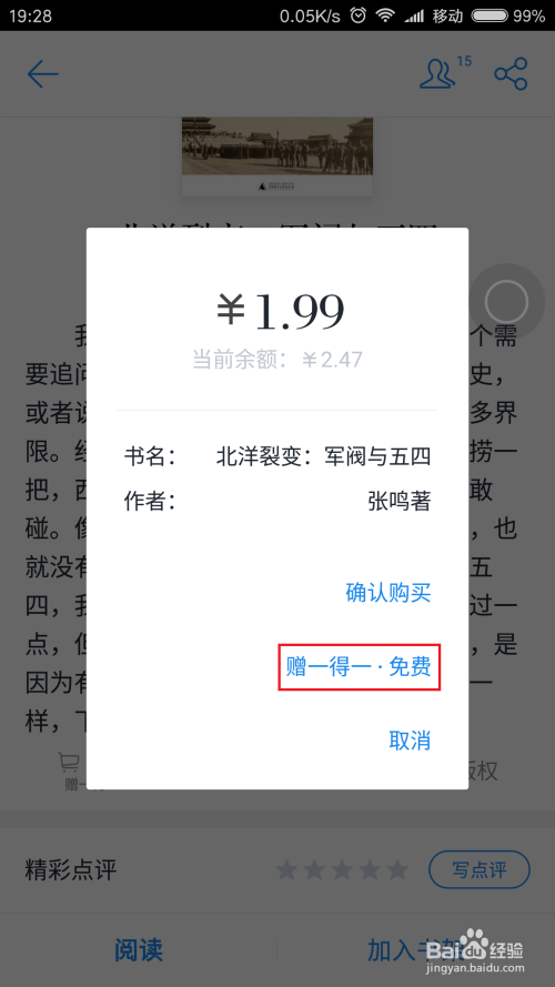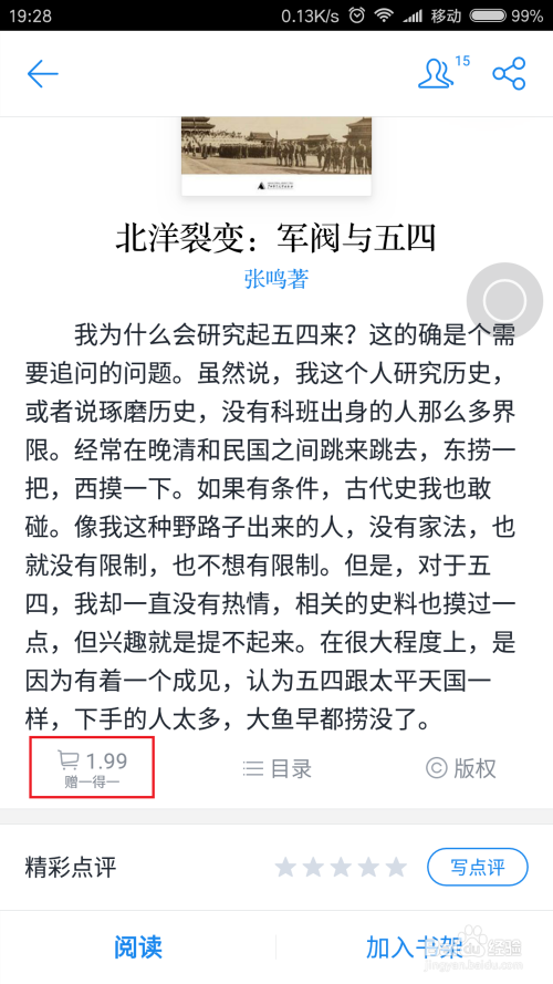 进入微信念书书城页面之后,我们可以看到良多可供下载或者阅读的册本,点击打开册本详情页面,我们可以看到“赠一得一”的字样,有该字样即可免费获得。