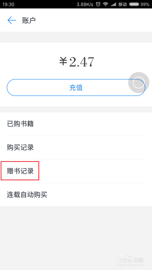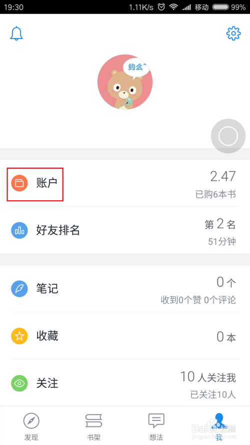 点击微信念书应用中的“我-账户”选项,点击之后即可在账户页面中看到我们采办的册本和赠书记实。