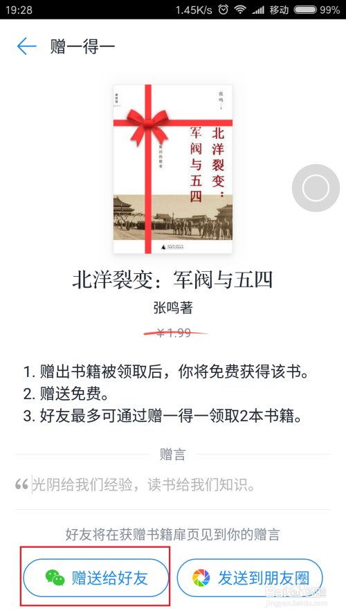 接下来,我们可以点击“分享”按钮,点击之后即可分享这本册本给老友,老友可以免费下载我们赠予的这本书。