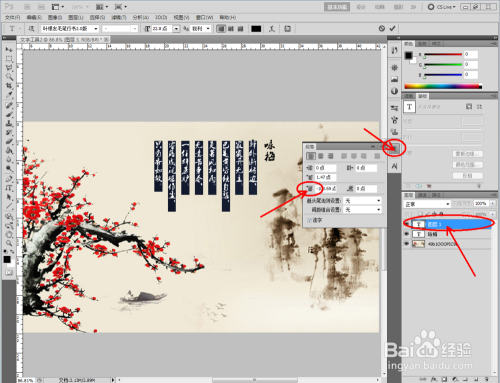 完当作后编纂诗句部门。点击作图区域,按图设置好文字的字体、颜色、大小等参数后,起头编纂文字内容。编纂完当作后,点击【段落】,调整好竖摆列距参数;
