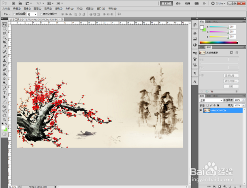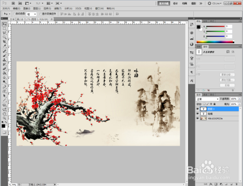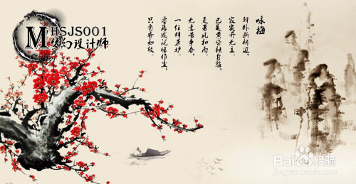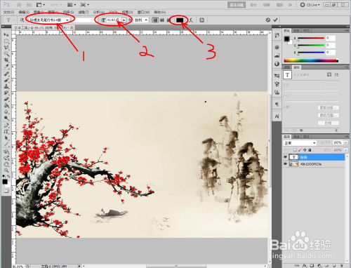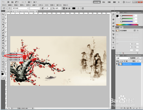 打开一张中国古典梅花山川图,点击【竖排文字东西】,点击作图区域,设置好文字的字体、颜色、大小等参数后,起头编纂竖排本家儿题文字‘咏梅’;