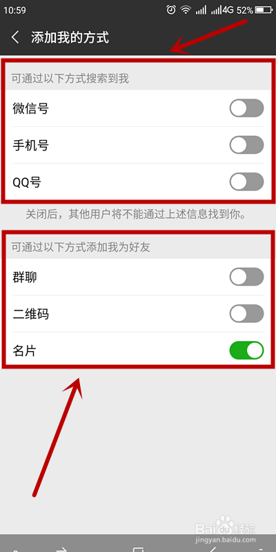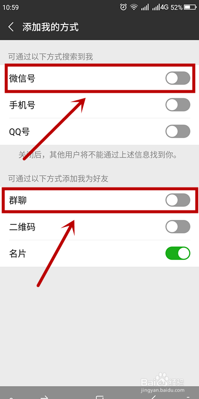 若是我们单击这里的“微旌旗灯号”,让后面的开关由灰色酿成绿色,暗示别人就可以经由过程微旌旗灯号搜刮到我。若是我们这里点击“群聊”,后面的开关,由灰色酿成绿色。就暗示别人可以经由过程群聊的体例添加我为微信老友。其他操作近似。