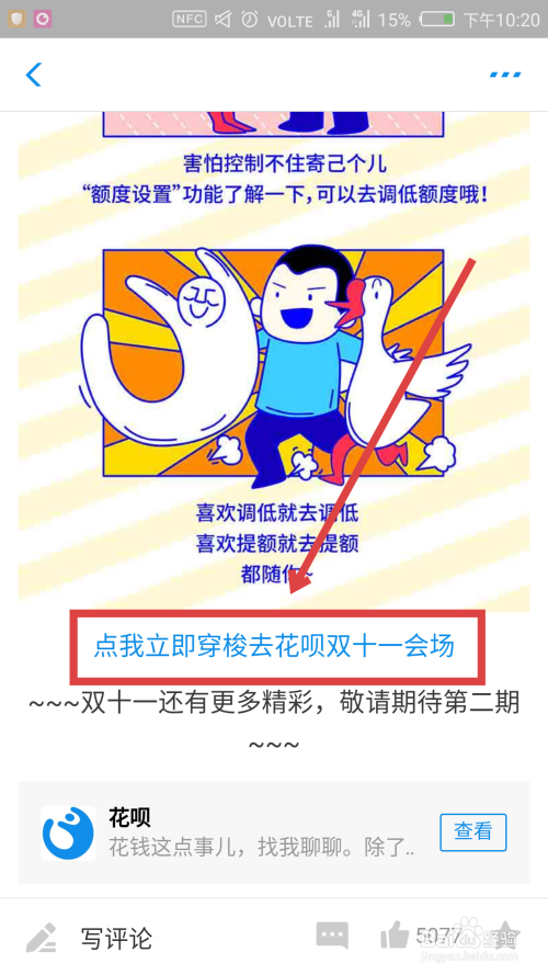 然后标的目的下翻,在文章的末从头至尾找到蓝色的【点我当即穿梭去花呗双十一会场】,点击进入。