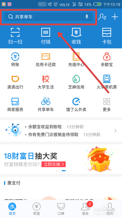 首先我们打开付出宝,点击界面最上方的搜索框,如图所示。