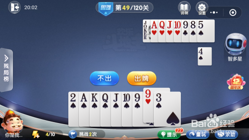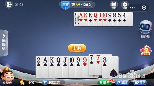 智多星打出8-Q顺子,我打出9-K顺子,接着打出一张A一张3就过关了。