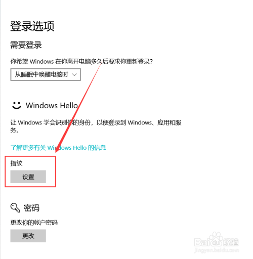 然后在右侧找到“指纹”,点击“设置”按钮。