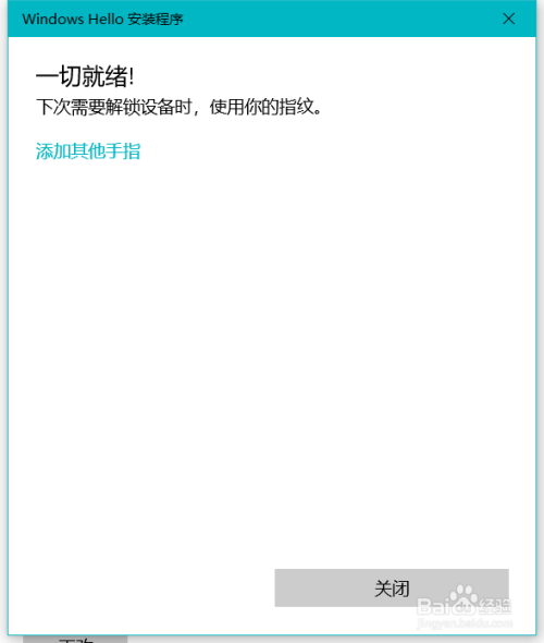 该手指指纹录入完当作后,可以继续添加其他手指的指纹,或者封闭该对话框。