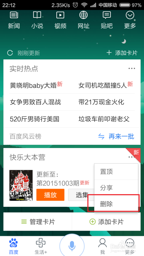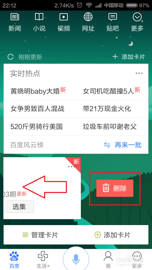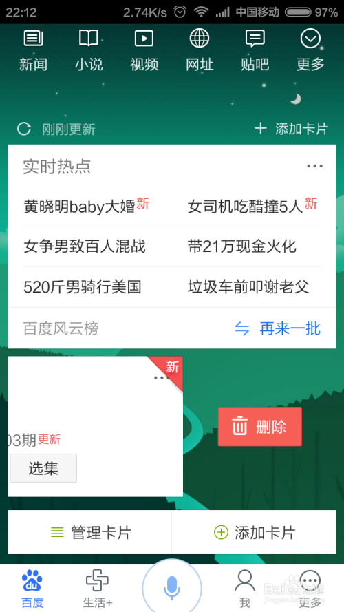 手机百度是一条目十分不错的应用,不仅撑持我们便利快捷的利用百度搜刮功能,还可以在互联网糊口中给我们供给便当。那么在该应用中,我们该怎么删除首页的卡片呢?接待大师速来围不雅我的经验啦。