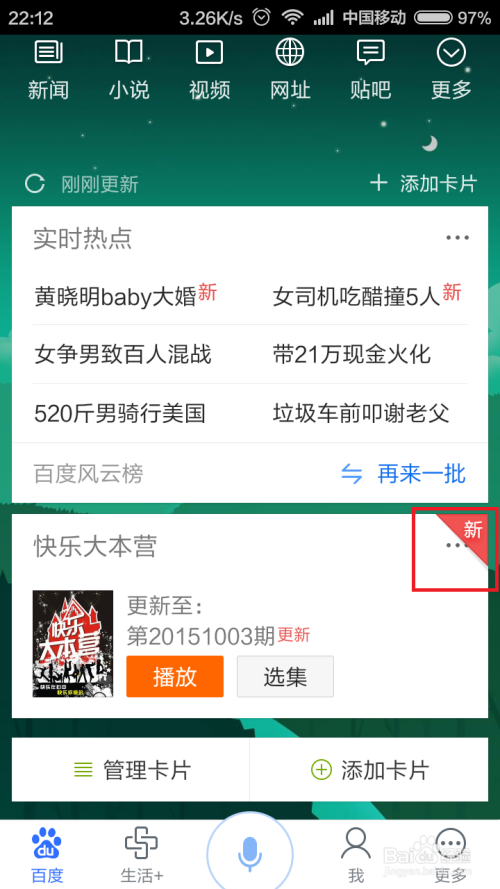 首先,请大师打开手机百度应用首页,点击应用首页页面中已经加载的卡片,然后点击要删除的卡片中的“····”按钮。