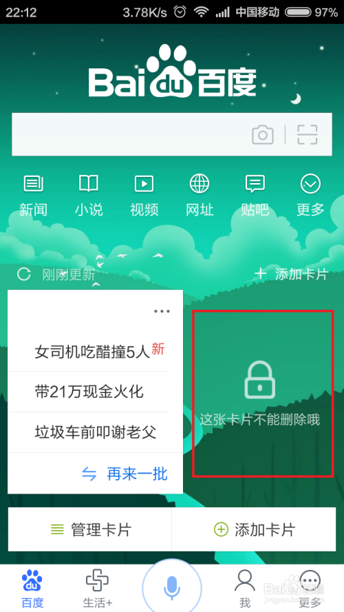 在右滑该卡片之后,页面直接弹出“该卡片不克不及删除哦”的信息提醒,那么就意味着该卡片必需存在于手机百度应用页面,将无法删除。这是应用在编码时就决议了其不成删除性,若是要将其删除的话,也许需要年夜神呈现才能搞定。