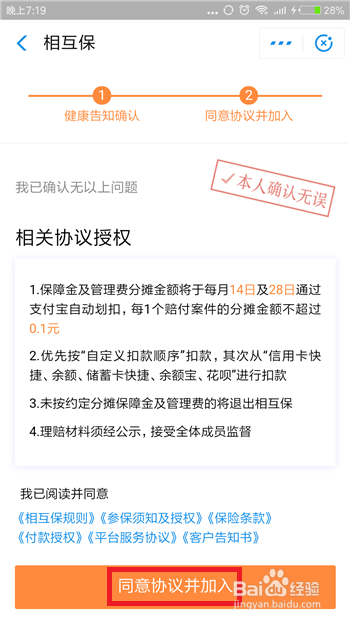 最后会进入到和谈授权界面,点击底部的【赞成和谈并插手】选项,如许就可以介入到彼此保了。